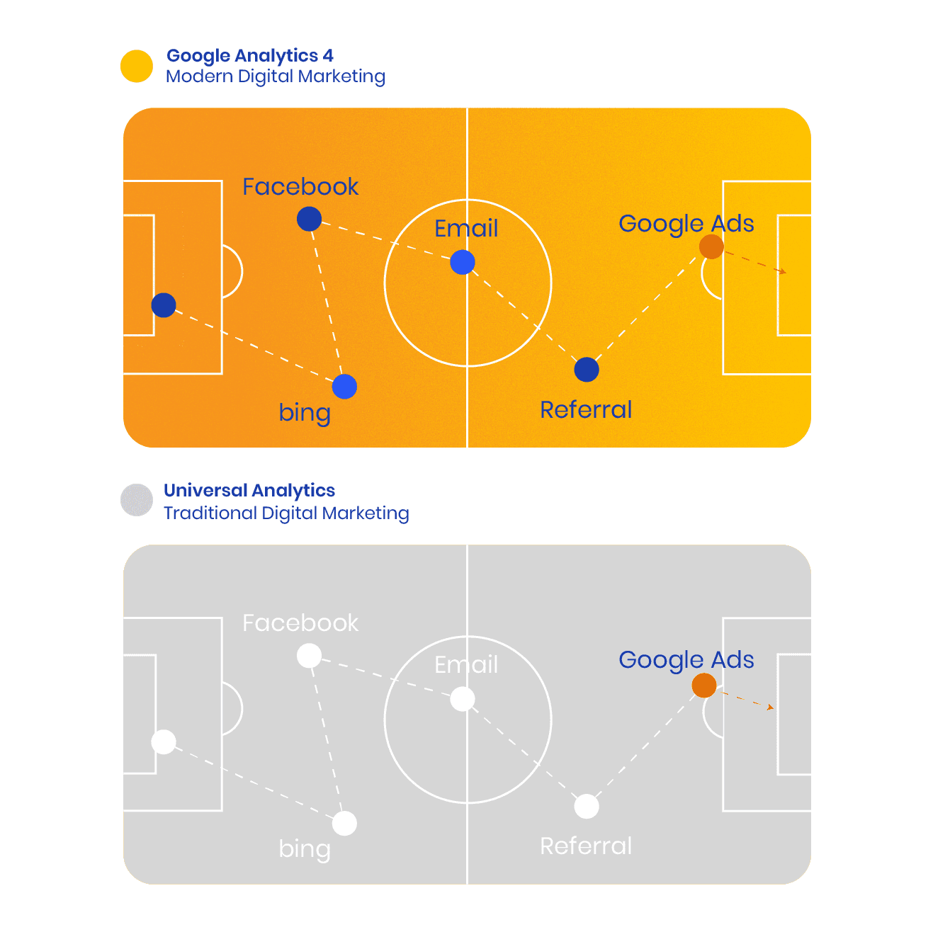 We've found that the best way to understand the potential of the GA4s measurement model is to imagine your marketing campaign as a football team, with each component (Facebook, Email outreach, Referrals, Google Ads, etc.) as a player.